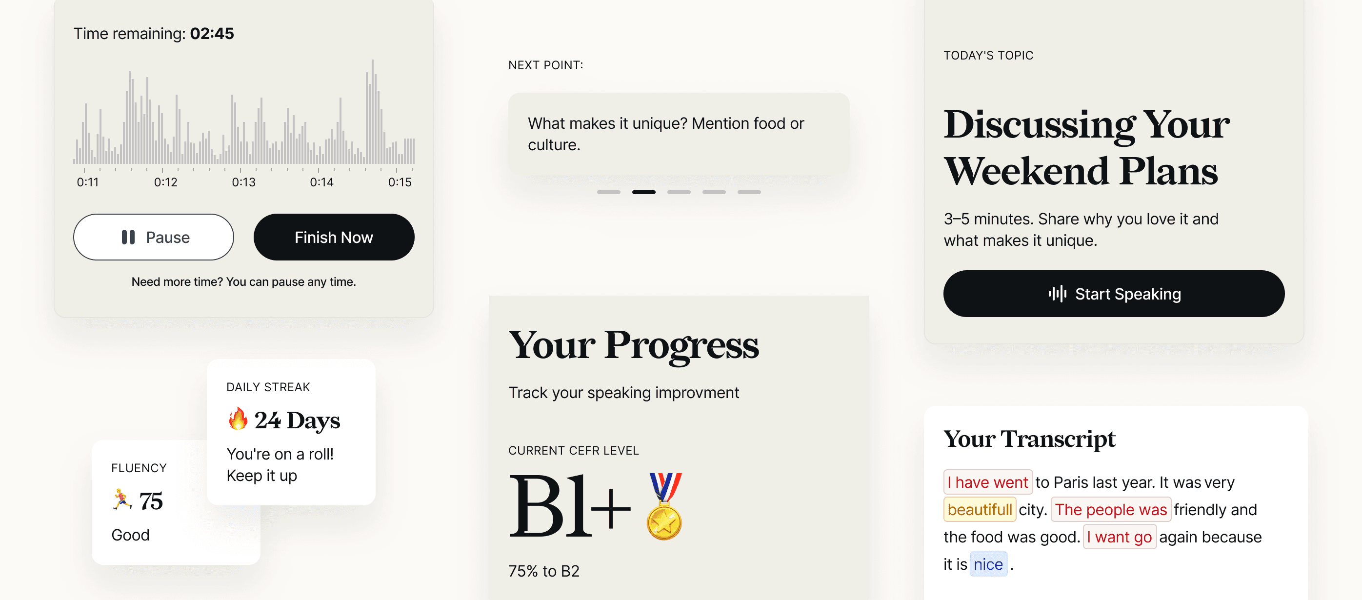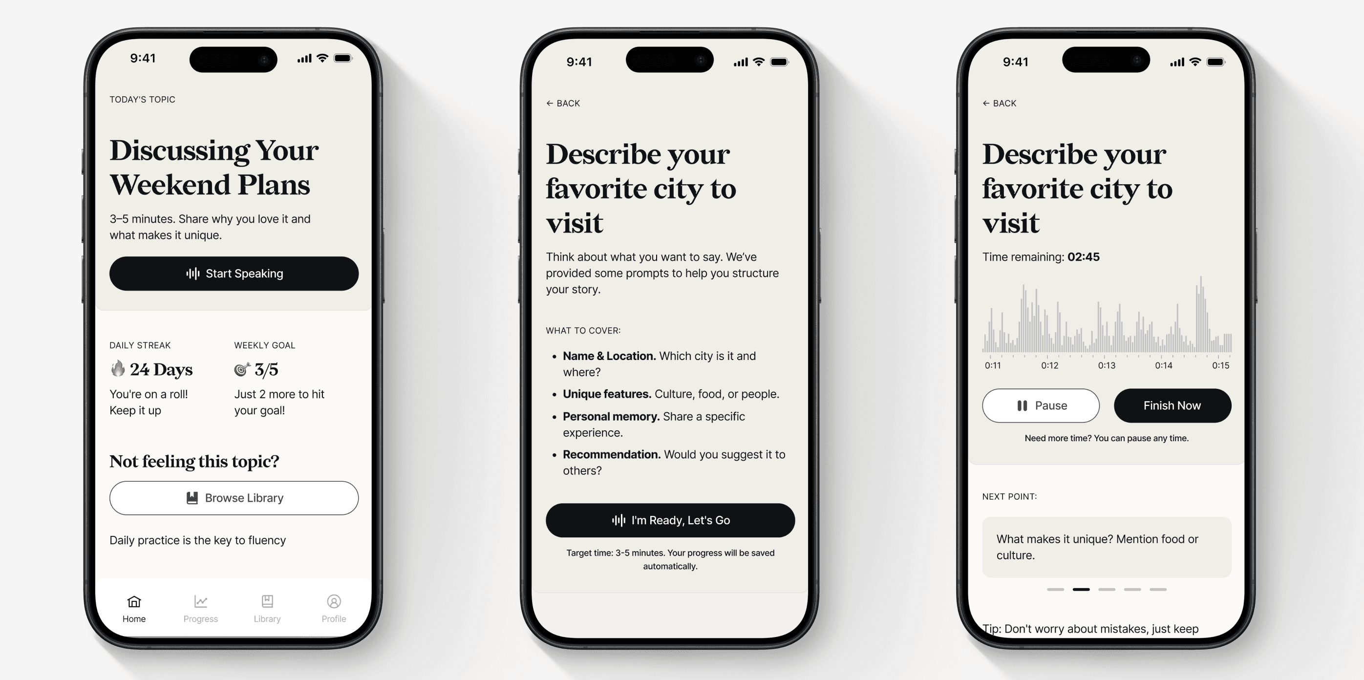 The Value: By providing these "scaffolds," the design reduces the stress of speaking into a void and ensures the user reaches the 3–5 minute target duration.