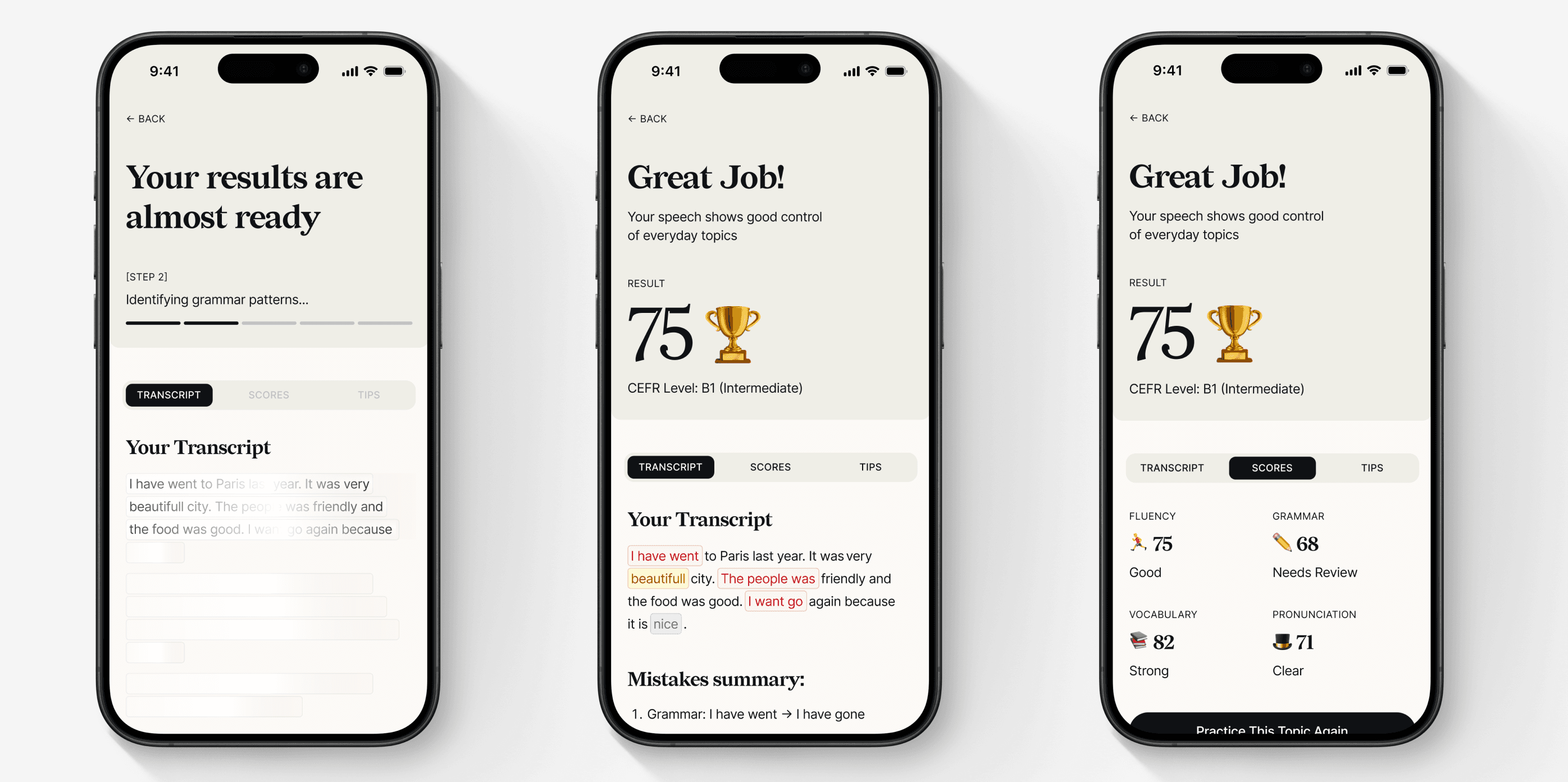 The Decision: I designed a "Professional Coaching" dashboard featuring color-coded error categories (Grammar, Pronunciation, Vocabulary) and a "Top 3 Mistakes" summary.