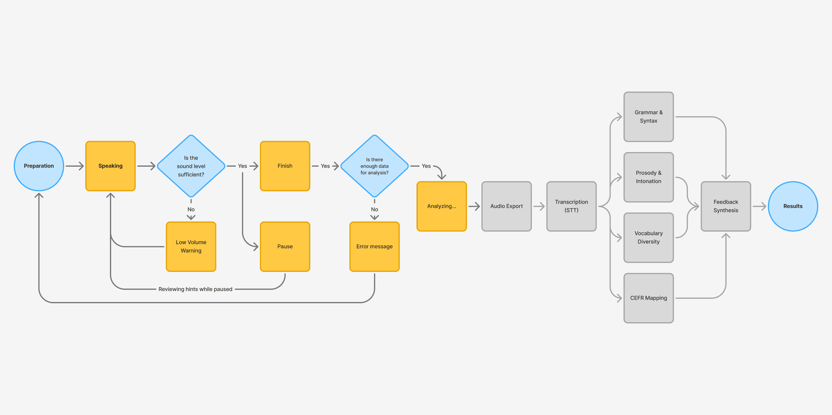 Parallel ML Processing: While the recording is in progress, the server performs real-time ASR (Whisper) to generate text. Once finished, specialized workers trigger forced alignment for pronunciation analysis and LLM processing for grammatical and lexical evaluation.