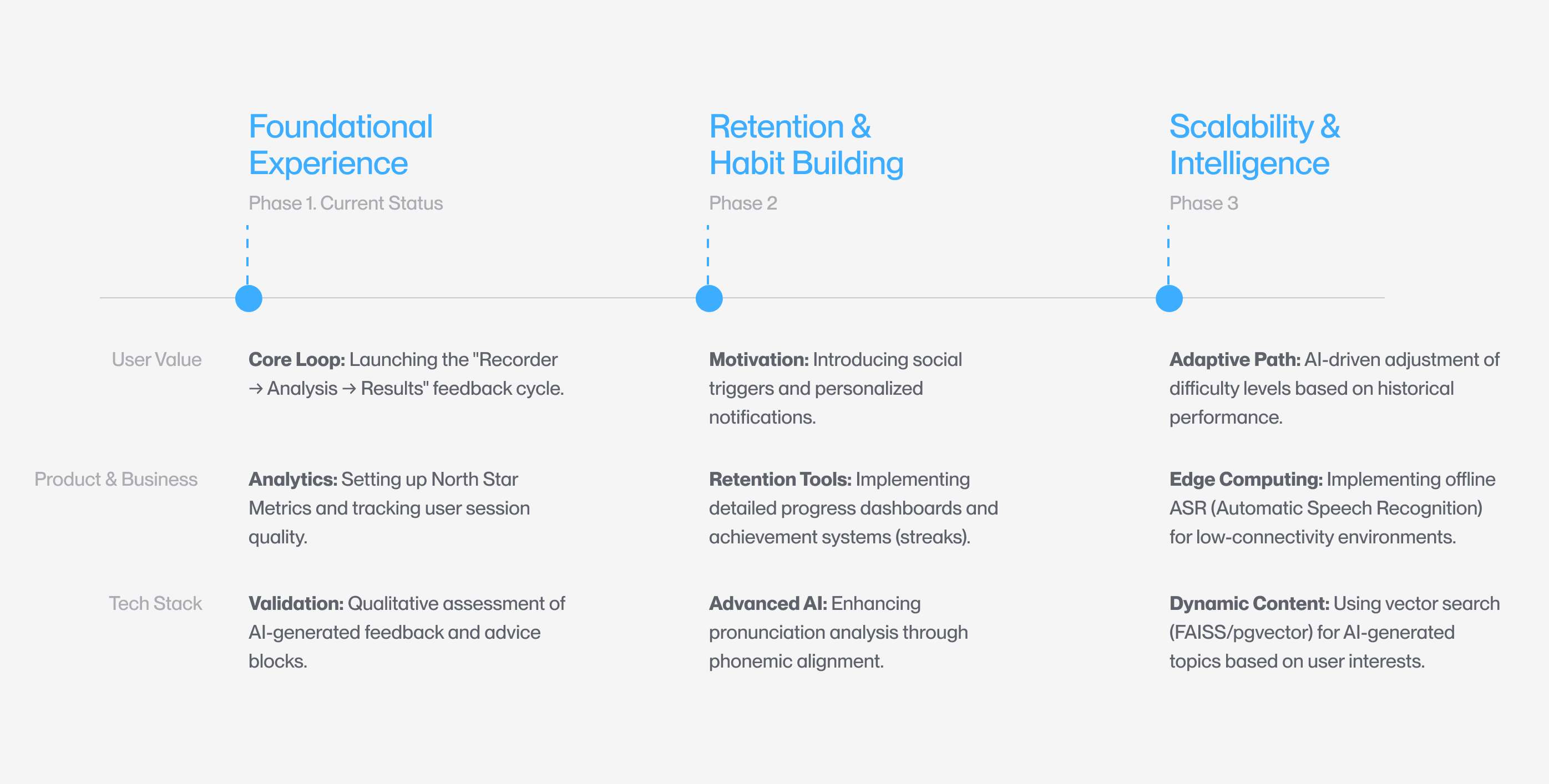 Phase 1 (Foundational Experience): Launching the core "Recorder → Analysis → Results" loop and defining North Star Metrics.