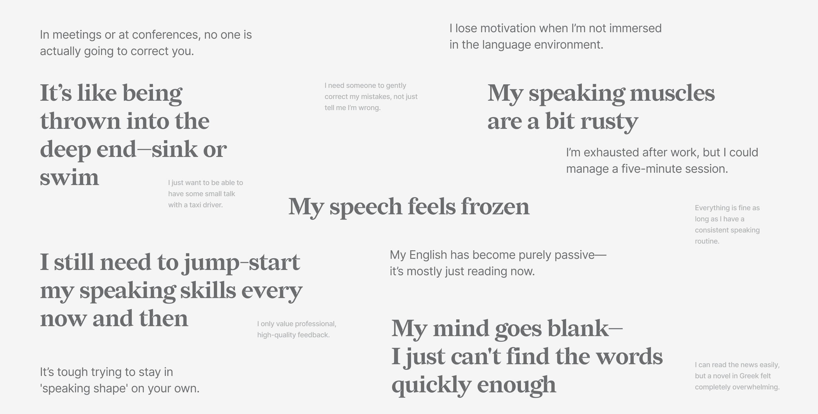 The Active vs. Passive Gap: While users can consume complex content (movies, articles), they lack the neural pathways to produce speech fluently, creating a frustrating disconnect between what they understand and what they can say.