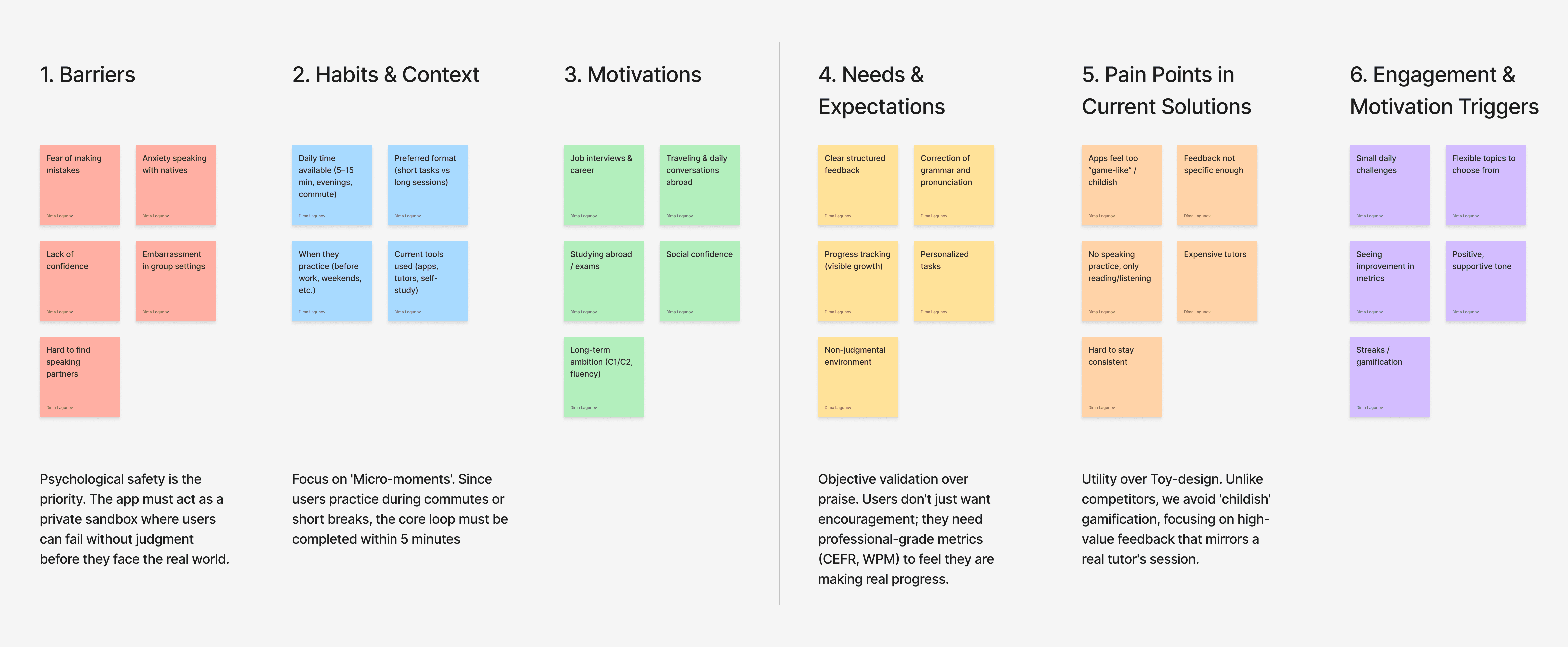 I used the Affinity Diagramming method to synthesize qualitative data from user interviews. This process allowed me to identify a critical gap in current solutions: most apps focus on passive learning, while users suffer from 'The Speaking Barrier'. This insight led to the creation of the Recorder-first architecture, prioritizing active production over passive consumption.
